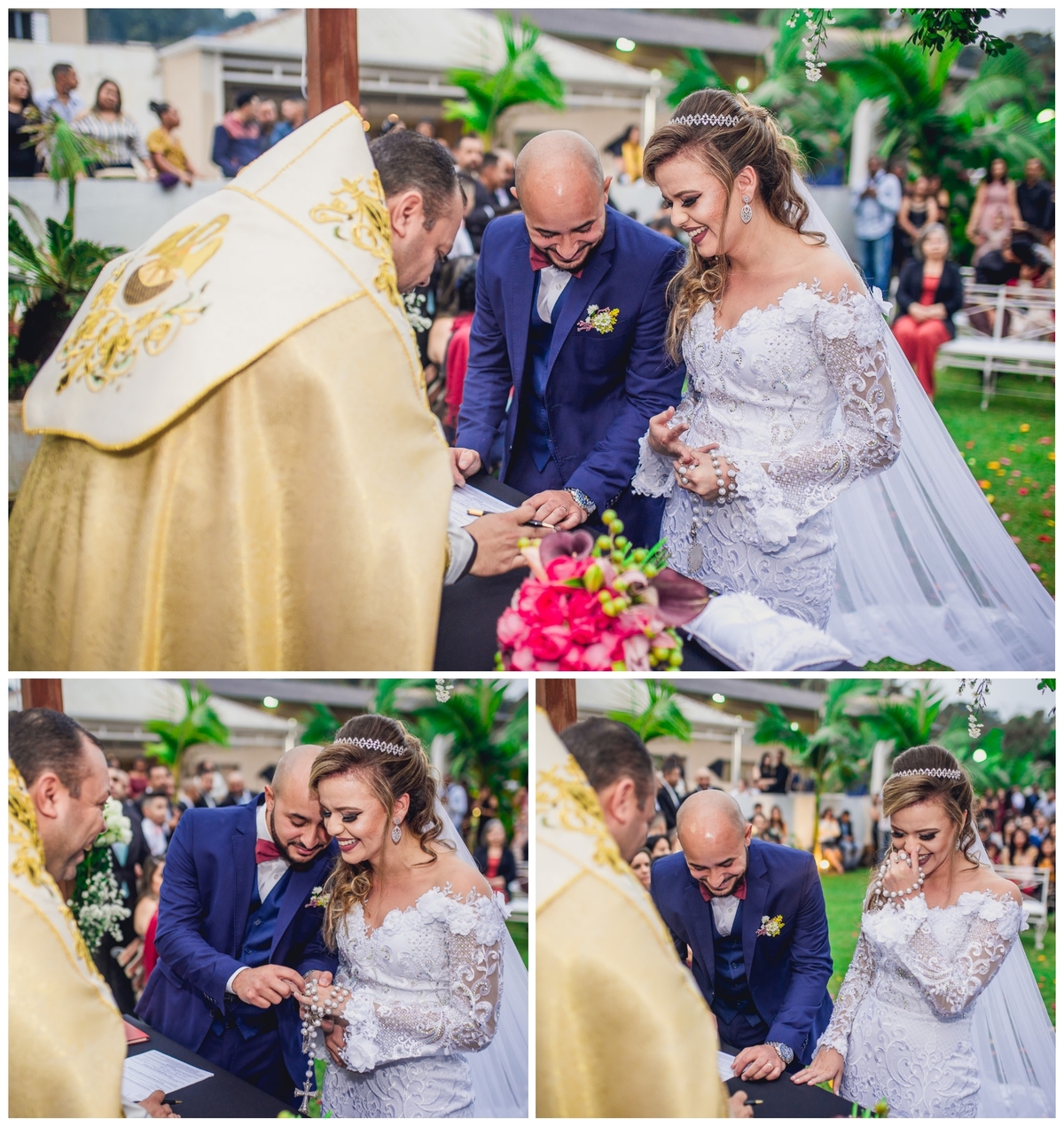 O dia estava maravilhoso, tivemos uma cerimônia no fim da tarde, tudo estava belíssimo, bem decorado, e a cerimônia foi incrível. Os noivos se emocionaram bastante e deram muitas risadas.